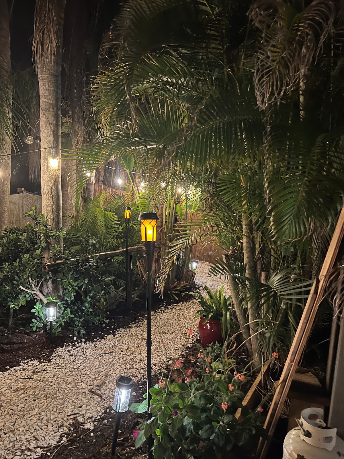 GLAMPING Just follow the tiki torches down a lush tropical path to a 2025 one bedroom 30’ RV. Enjoy the very private escape on a large lot shared with a 1920s historic home. You will enjoy the private off street parking. There is a short one block walk to historic “Bean Depot” Restaurant featuring live music. The 2025 RV is fully equipped. It is surrounded by a paver patios and lush tropical landscaping. There is also an attached deck with a pass-through window to the kitchen. The amenities