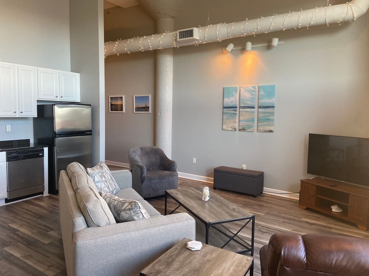 Want a getaway along the Lake Erie Shores, then you have found it! Our historic newly renovated spacious condo comes with everything you would want. The joint living, dining, workstation, and kitchen area boasts one of the largest living areas in all of the Lofts.Its location is ideal, next to the Goodtime cruise ship and Jet Express for a quick ride to Kelley’s Island and Put-in-Bay, and within walking and biking distance to many restaurants and attractions…and a short drive to Cedar Point!