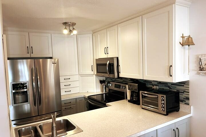 Enjoy the best views in the complex in this upper level, corner unit! *Climbing stairs is required This newly remodeled, 1 bedroom condo is comfortably furnished & equipped with everything you & your family need! Just steps from the Jet Express, you can enjoy the day at Put-In-Bay then come back to relax in the King size bed. The space offers a full kitchen, a coffee bar, desk for working, & sunroom for enjoying the view! Perfect for families- we provide a PackN'Play, highchair & beach toys!