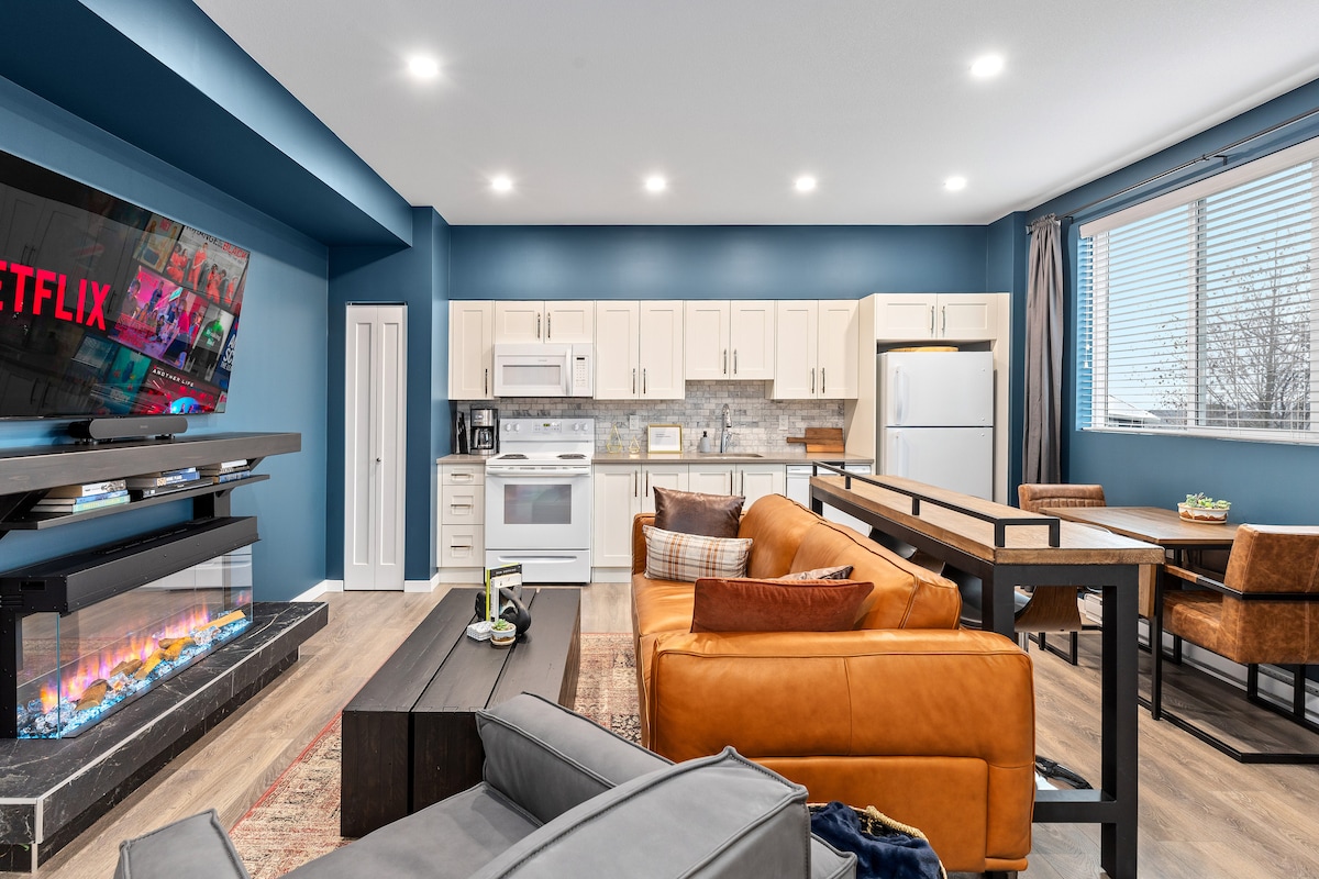 Guests love our top 5% home: sparkling clean, beautifully designed, and incredibly comfortable. Boutique-style suite with high ceilings, a luxurious king bed, and comfort better than a hotel stay. Enjoy a sunny living room, in-suite laundry, 1G Wi-Fi, 52" smart TV with Netflix, free coffee & tea, private entry, and free parking. Thermostat heating and naturally cool in summer. Walk to transit, parks, and trails; a short drive to shopping. Perfect for couples, families, solo, or business stays.
