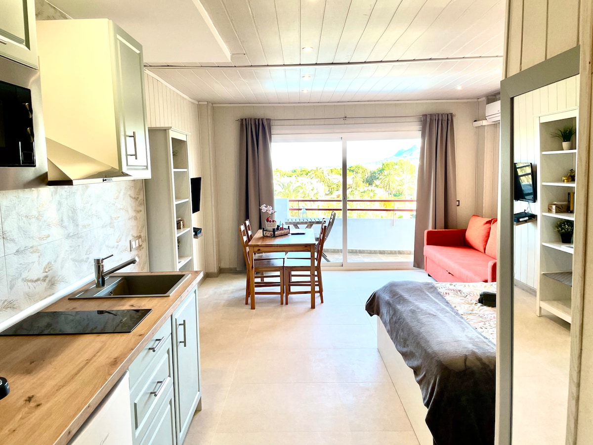 Studio in Puerto de Alcudia. Renovated in 2024. Located in the Siesta 2 building in the lively and equipped Bellevue complex. The bed is 160cm, the sofa bed is large. 800 meters to the beach. You can access with key code. High Speed wifi, air conditioning and SmartTV. Kitchen with microwave and fridge. The building has a free outdoor parking. You can park your car on the street also for free. Important: Legal holiday rental license ETVPL/12739 and European Unique Short-Term Rental Number.