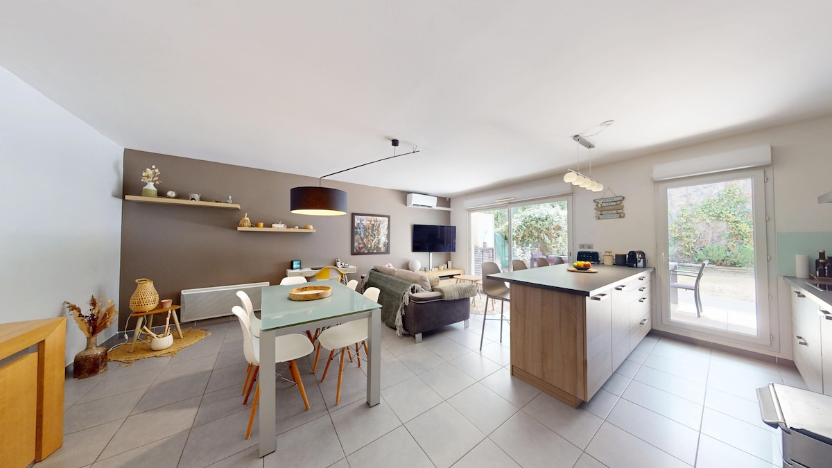 T2 de charme 30 m2 au calme, chambre indépendante. Salon, cuisine équipée ouverte, vaisselle, plaques induction, hotte, four micro ondes et grill, cafetière SENSEO, Bouilloire, Grille-pain, Cuit-vapeur, Frigo Top, Congélateur Top. Salle de bains avec douche italienne et lavabo 1 vasque. WC séparés. Chambre Literie qualité Hôtelière, 2 lits 90x190 pouvant être réunis en 1 lit 180, 1 Placard, 1 commode, 1 bureau télétravail. Salon canapé méridienne convertible 140x190, TV SAMSUNG HD, WiFi fibre