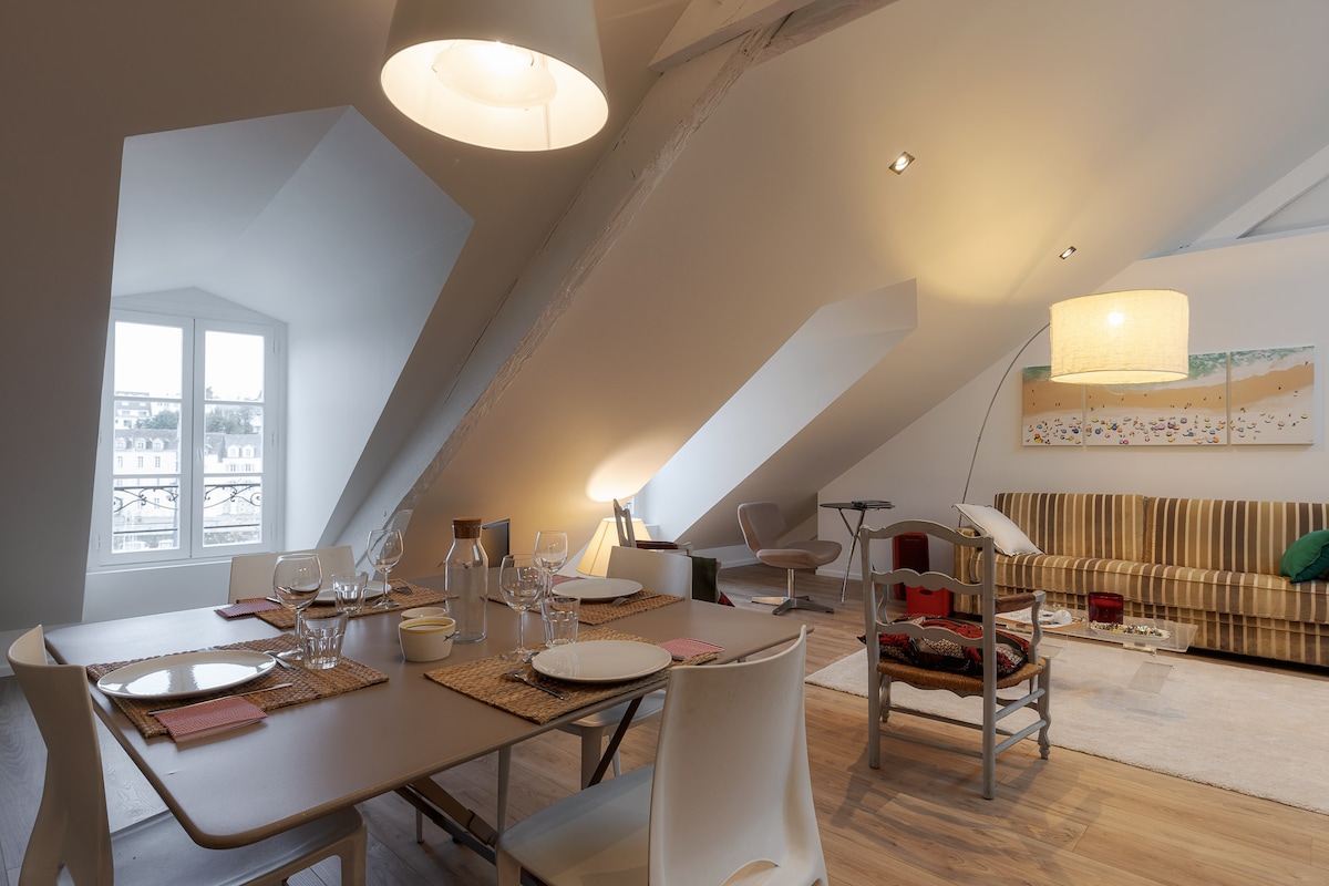 Au coeur de l'intra muros. Bel appartement confortable 44m², au 2ème étage d'un immeuble XVIIè. Vue imprenable sur jardin remarquable et toits de la ville. Situé au coeur du centre historique et des rues piétonnes, à proximité des boutiques, des halles, du marché, de la Cathédrale, des musées et du port de Vannes. Le logement comporte un grand séjour, une chambre cosy avec lit queen size de grande qualité, une vaste salle de bain et une cuisine équipée. Décoration soignée et chaleureuse.