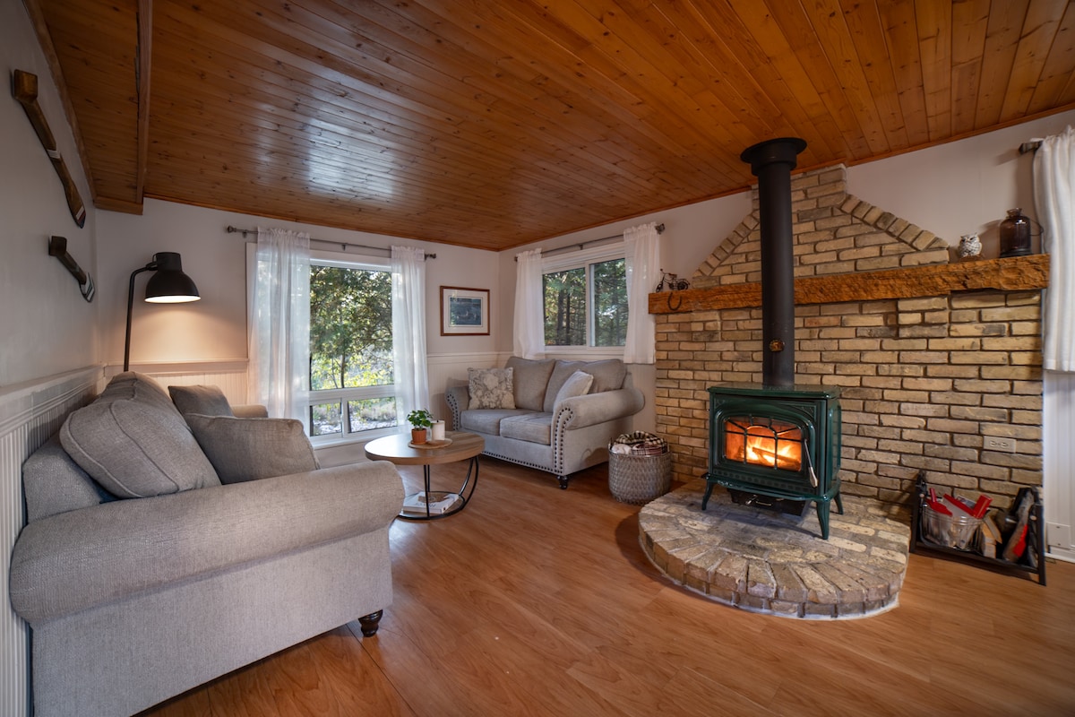 Escape to Heirloom Tiny Home - where macro luxury meets a micro footprint. Nestled on 23 peaceful acres, surrounded by aspen and pine forests, just 10 minutes from the picturesque town of Elora. Wake up to serene pond views as horses and sheep graze in your view. Organic linens, artisanal soaps, and a spa-like bathroom soothe the senses. Cozy up by the indoor fire and gaze at the stars. Enjoy fine dining at the Elora Mill and Spa, enjoy popular shops or hike the Elora Gorge nearby.
