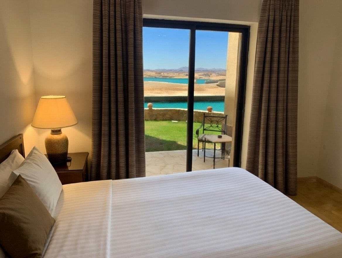 Stylish one-bedroom at Port Ghalib Marina with queen bed, sofabed, fully equipped kitchen, two bathrooms and balcony with beautiful marina and sea views. Just 5 minutes’ walk to a private beach and steps from restaurants, bars, shops, bazaar and diving centers. A restaurant next to the building has live music on Wednesdays and Thursdays, creating a lively vibe, so light sleepers may hear some music on those nights till midnight.