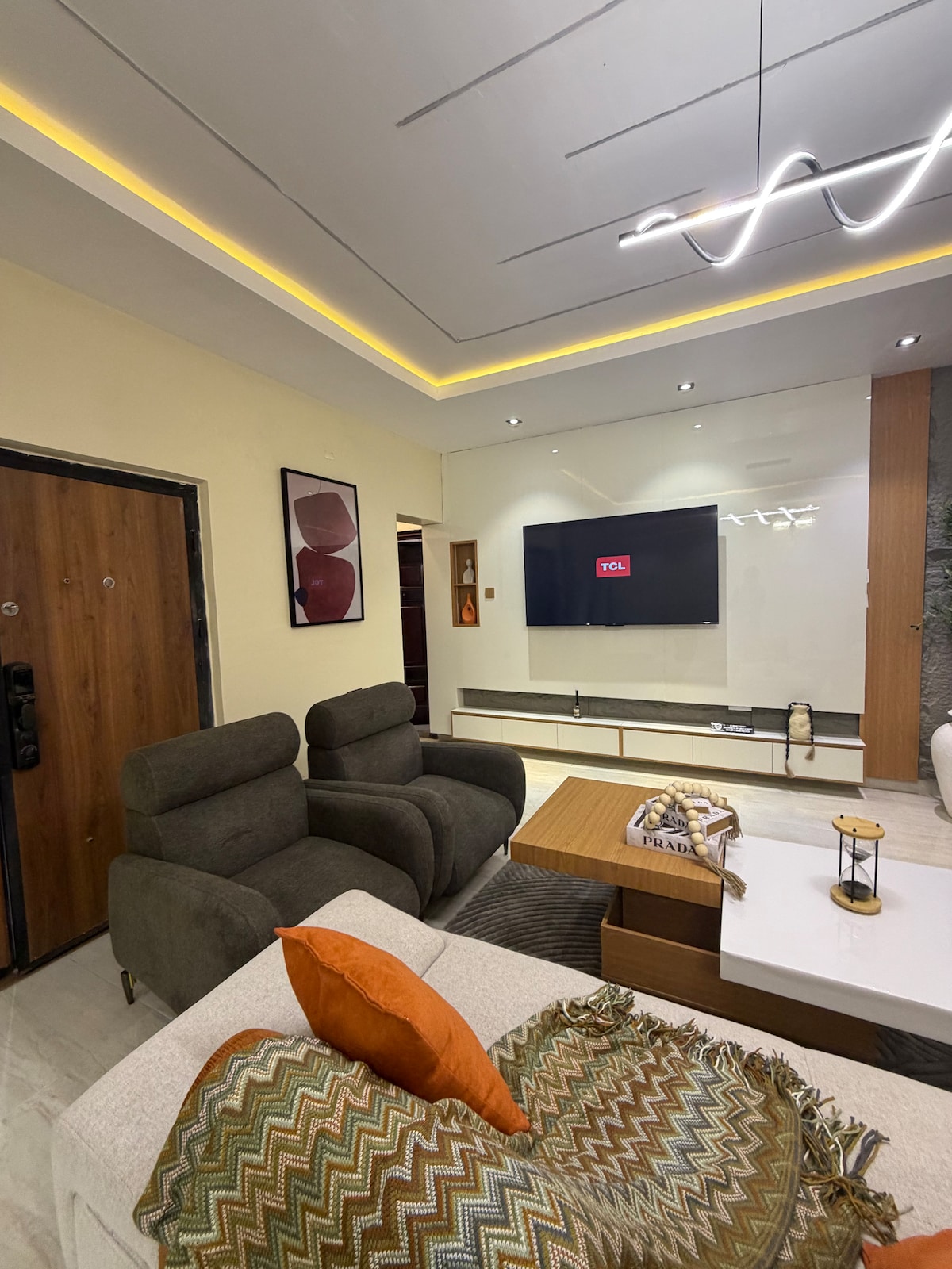 Forget your worries in this spacious and serene space with top-notch security and an amazing 3rd floor view. This apartment is perfectly suited for business trips, couple with children or couples looking for a romantic location. The apartment consists of modern fully-equipped spacious kitchen and a sunlit living room with a 52” TV, free Netflix, free WIFI network. Located within walking proximity from major eatery and supermarkets like Dominos, Coldstone, marketsquare and Kilimanjaro.
