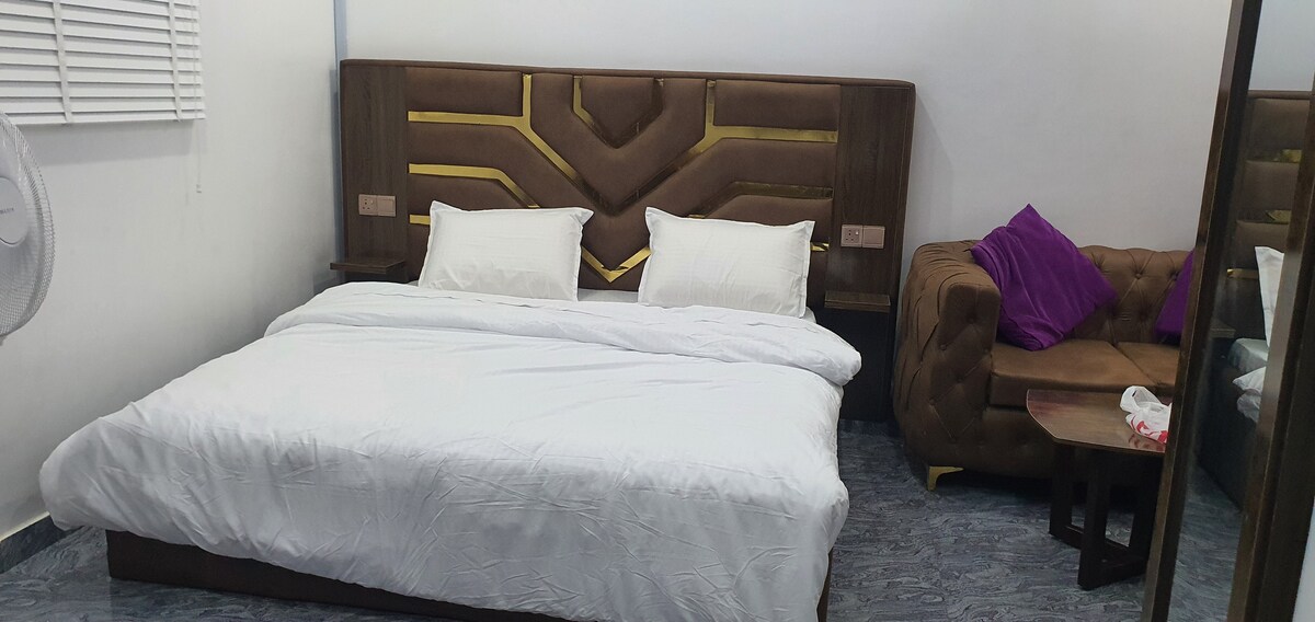 Forget your worries in this spacious and serene space with top-notch security and an amazing 3rd floor view. This apartment is perfectly suited for business trips, couple with children or couples looking for a romantic location. The apartment consists of modern fully-equipped spacious kitchen and a sunlit living room with a 52” TV, free Netflix, free WIFI network. Located within walking proximity from major eatery and supermarkets like Dominos, Coldstone, marketsquare and Kilimanjaro.