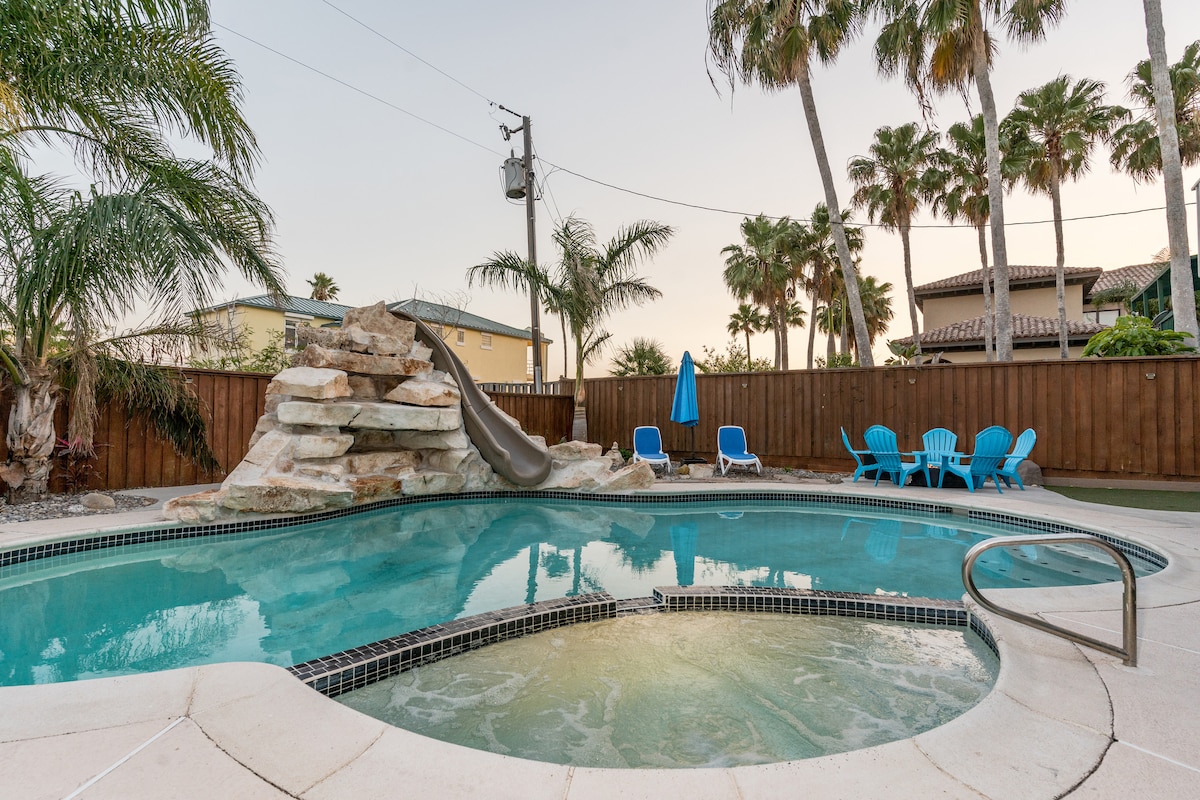 Top rental on South Padre Island!! Escape to South Padre Island’s clean & luxurious beach house! Perfect for big families or friend groups, this stunning home boasts 4 luxurious king bedrooms and a fun bunk-room for kids or extra guests. Enjoy a hotel-like experience with a thoughtful design, all in a private, cozy setting. SPI adventure starts here. Reserve today! Brand new heated pool and 8-person spa in the backyard! Featuring a large tanning ledge, pool volleyball, and tetherball.