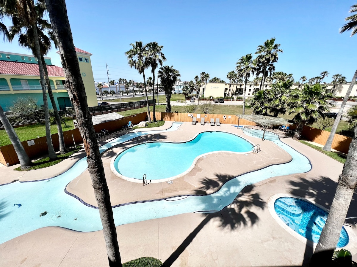 Luxurious & newly renovated condo, located on the Gulf Side, short walk to beach. Perfect location & ideal for group trips, family vacations, romantic getaway, birthday’s or bachelorette/bachelor party pad with all the popular bars & restaurants at just a 1-2 minute walking distance. A short walk to a wonderful clean beach access, your stay is sure to be a comfortable & lush one! Our space sleeps up to 10 guests, a front patio area & cute balcony looking over our two private pools.