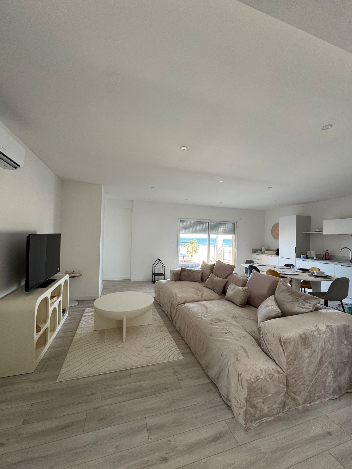 Large apartment with 3 room, fully renovated with balcony, breathtaking view on the Mediterranean sea, direct access to the beach, all amenities on foot. Equipment: dishwasher, washing machine, free Wifi, television. Big Cellar of 13m2 to keep bicycles or nautical material... private parking at the foot of the residence. Self check-in with smartlock & keypad