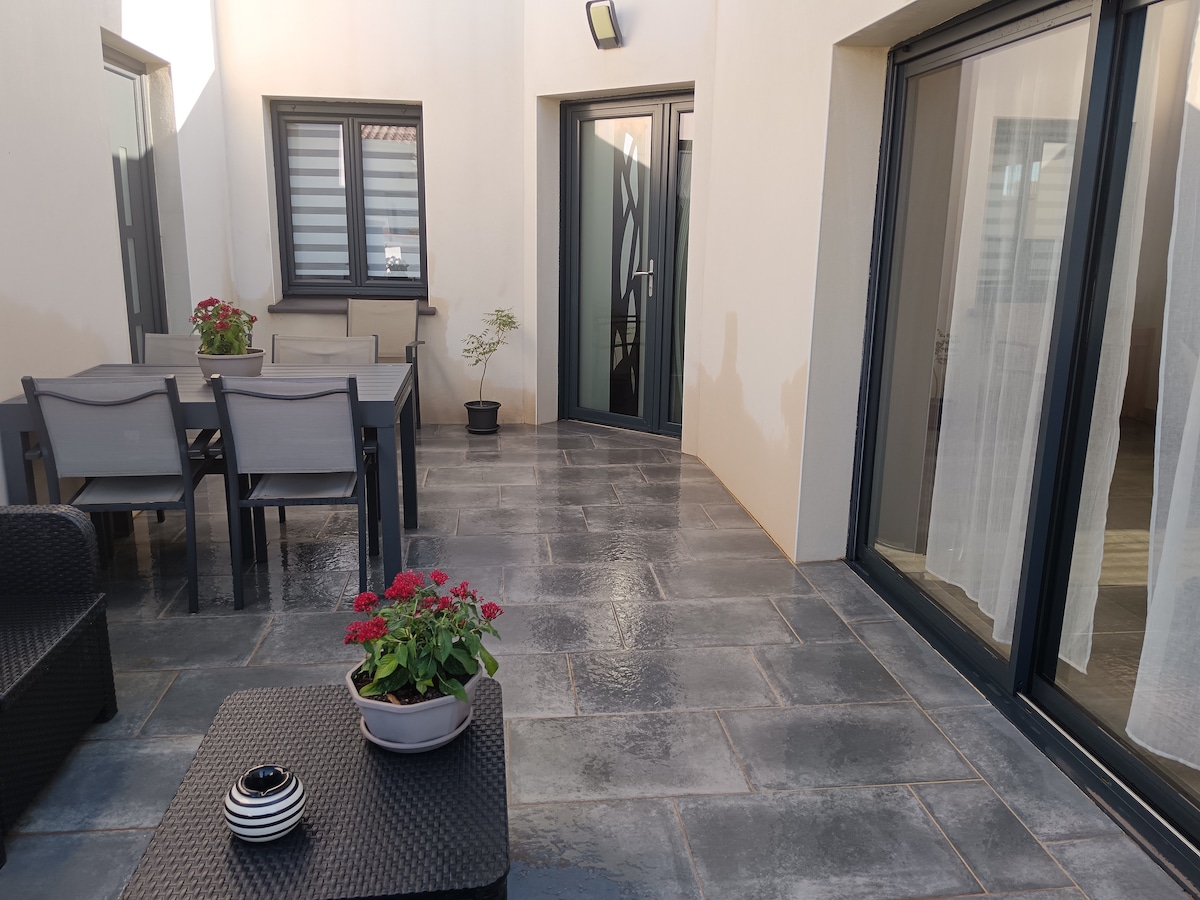 Maison neuve de plain pied dans quartier pavillonnaire, à 1 km de la plage, du port et des commerces. Grande pièce à vivre avec une cuisine bien équipée: four, micro ondes, réfrigérateur américain, lave vaisselle, lave linge. Nombreux rangements et maison entièrement climatisée Terrasse ensoleillée avec salon de jardin, parking à vélo..