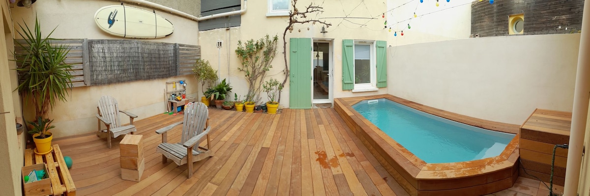 beau quartier de narbonne a 3min a pied des halles et du centre ville dans maison d'habitation studio tt équipée independant 23m2, cuisine equipée, sde wc il propose un patio de 15m2 clos pour profiter du soleil au calme stationnement gratuit tout autour l'acces s'effectue par un garage ou il est possible d'entreposer velos, moto ou autres le temps du sejour au plaisir de vous accueillir !!! Du logement vous êtes : 10 min a pied du musée NARBO via et de la GARE a 2 km des grands buffets