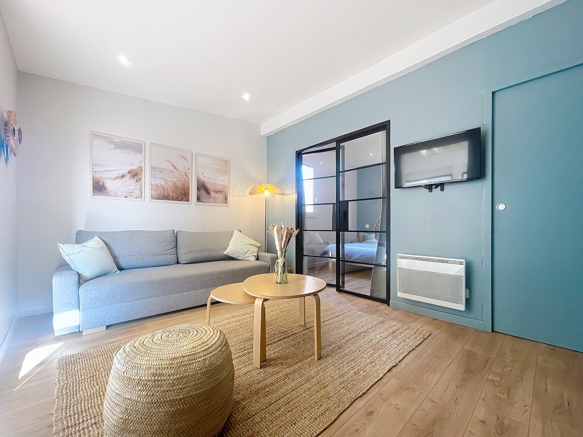 Profitez d'un logement élégant et central. Appartement dans résidence sécurisée, ascenseur, parking privé, local vélo, entrée autonome, accès direct sur le Port. Situé au pied des commerces, restaurants, bars, animations, marché, criée et à 500m de la plage. Tout confort, intégralement rénové au goût du jour, literie et mobilier neufs de qualité, draps et serviettes toilette fournis. Lit parapluie BB et chaise haute. Surface hab 25 m2. NB : Pas de climatisation. Ventilateurs dans chaque pièce.