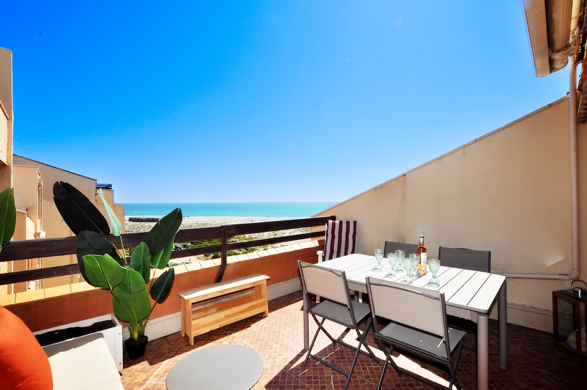 Profitez d’un appartement baigné de lumière avec sa terrasse face à la mer et la plage, sans vis à vis. Appartement 2 pièces d'environ 30 m2, terrasse 10 m2 et place de parking privative. Prestations de confort dans un style moderne et épuré. Il est situé au 2è étage (sans ascenseur) d’une résidence très calme. Le linge est fourni (lit + toilette). Literie récente (2024) 140x190. 2 TV. WIFI (fibre). Idéal pour 2 personnes