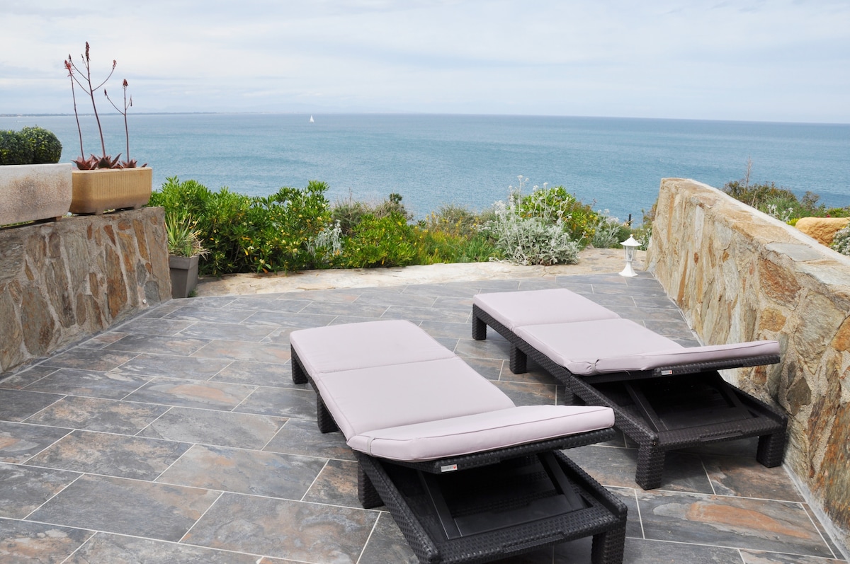 Située entre Collioure et Port-Vendres cette villa mitoyenne rénovée offre une vue exceptionnelle sur la Méditerranée et permet un accès direct aux criques et aux plages situées en bas de la résidence. Profitez d'un apéritif inoubliable le soir face à la mer en regardant le coucher de soleil! 2 terrasses de 30 m2 dont une sur la mer, plancha, cuisine équipée, coin repas, salon avec canapé convertible, 2 chambres, parking privé, WIFI. Draps et serviettes de toilette non fournis.