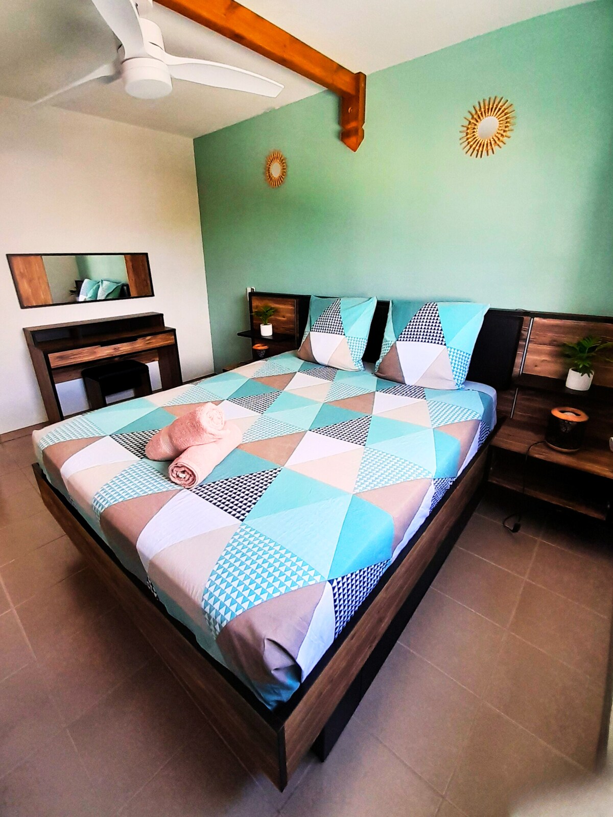 Cette Villa est proche de tous les sites et commodités. Elle dispose d’un jardin et d’une piscine privative. Cuisine entièrement équipée et lave linge. La première chambre dispose d’un Dressing et d’un lit King Sixe (180X200) en bois de Bali. La deuxième chambre dispose de deux lits de 90X200 cm, qui peuvent se transformer en un lit de 180X200 cm. La plage la plus proche est à 3 kilomètres, le centre commercial à moins de 5 minutes. La salle de bain dispose d’une douche à l’italienne