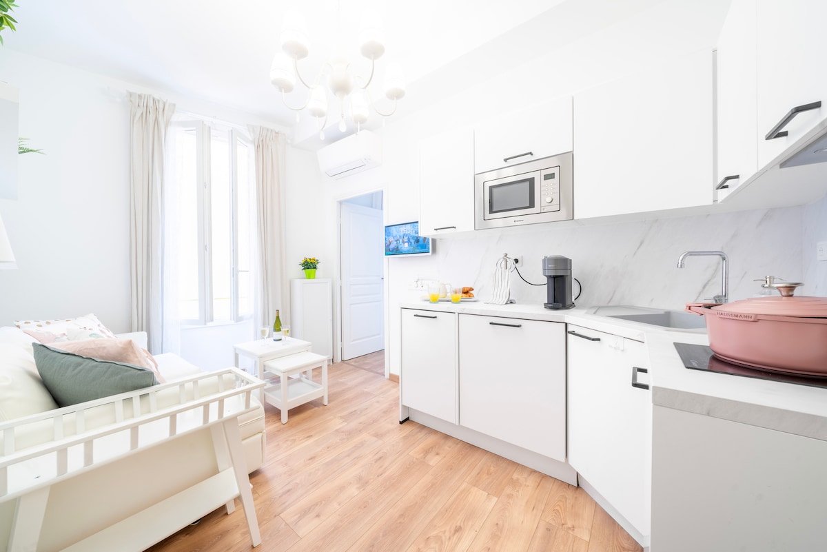 Charmant petit studio rénové avec goût, idéal pour découvrir Nice à pied. Situé à deux pas de la place Masséna et du Vieux Nice, il offre tout le nécessaire pour un séjour agréable : climatisation, cuisine équipée, ambiance moderne et cosy. Parfait pour les esprits jeunes et dynamiques qui aiment bouger et profiter de la ville. 5ᵉ étage sans ascenseur — un peu de cardio, beaucoup de charme !