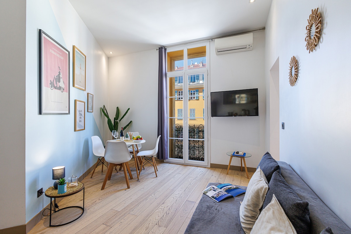 A dreamed stay in the French Riviera. The Haliviera studio is in the Carré d'Or (Golden Square) of Nice, 1 minute walk from the Promenade des Anglais and its beach, with Gym and Spa in option. The studio is air-conditioned and perfectly equipped with everything you need: Wifi, TV with Netiflix, a complete kitchen and some surprises. Ideal for a couple, you will have an excellent stay with all the necessary comfort. Enjoy a coffee on our balcony overlooking a quiet garden. Welcome.