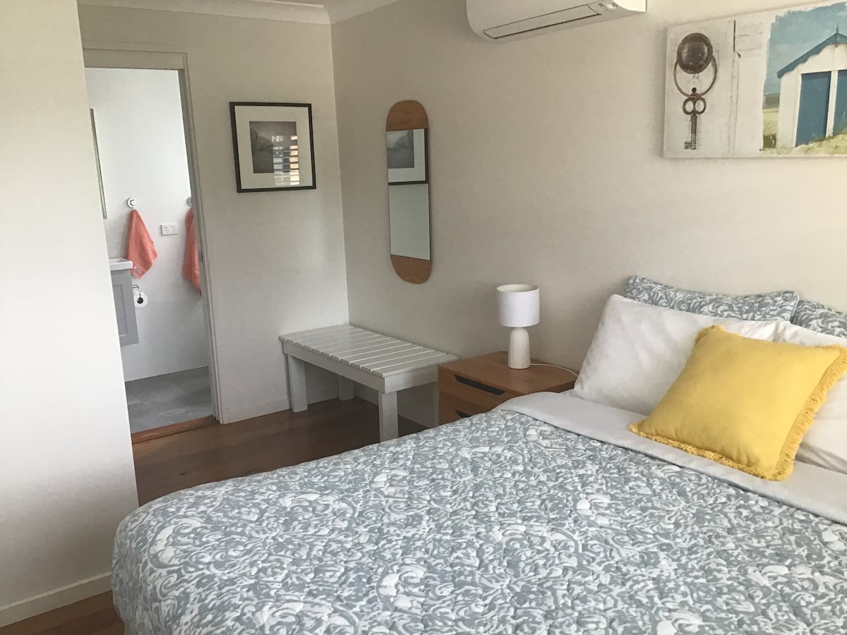 Our place is situated within an easy 5 min walk to the main street, restaurants and cafes & only 10 min walk to Town Beach. Our studio is a separate unit underneath our new in-town house. It has private access and opens up to a very large alfresco area with lawn & garden. The studio has a separate bathroom with a real shower, toilet as well as separate kitchen, fridge, hotplate & microwave. It contains a King size bed, air-conditioning, lounge sitting area and access to WIFI. Great for couples