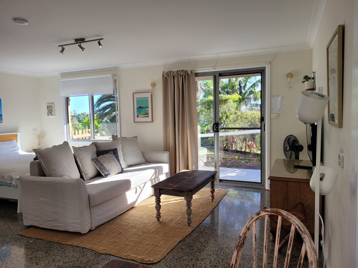 Relax in a cosy comfortable apartment private patio/yard and a tranquil tropical garden view … then a short walk to our family friendly Shelly Beach via the grocery/ takeaway store and rainforest walk No Breakfast but Nespresso coffee machine and some milk and teas provided. Fully equipped kitchen/some pantry items Suits couples with one child and a baby or one extra adult in King single bed in living area Separate entrance, hosts upstairs. Enjoy, restaurants and great holiday activities