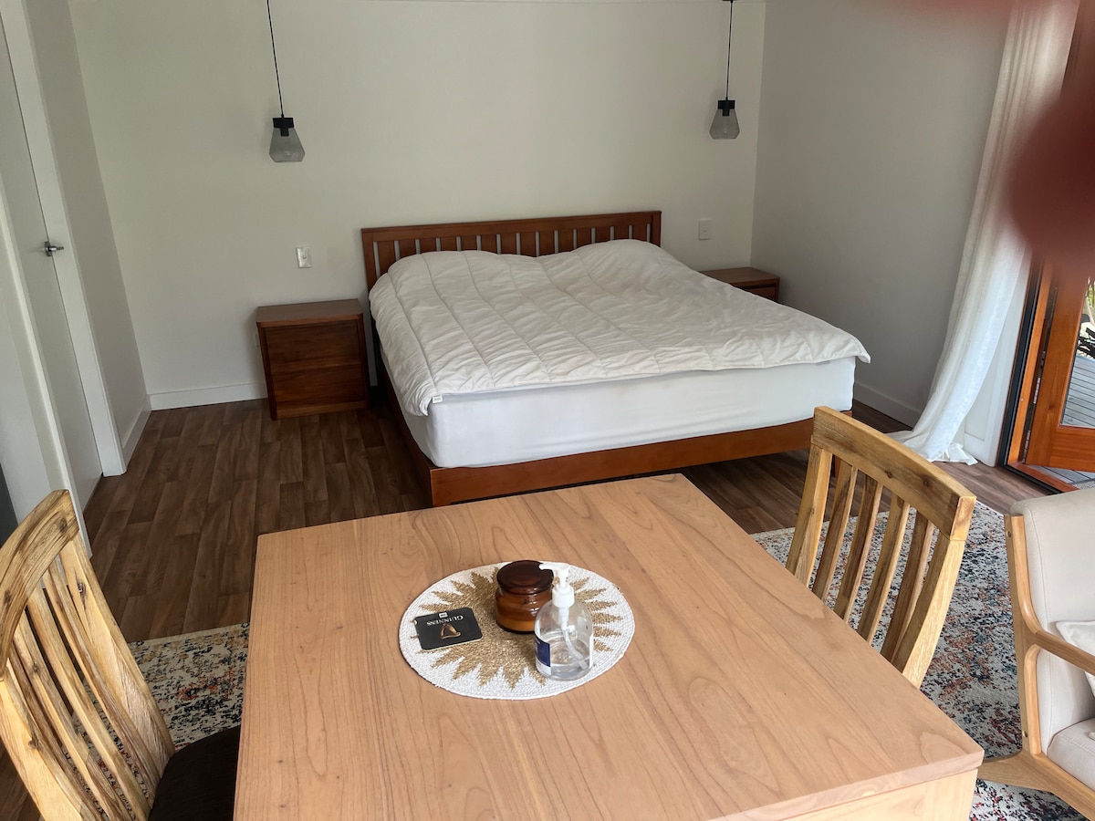 Cute couples retreat, dog friendly, for an overnight stopover or a minimalist staycation. The self-contained, private guesthouse features a bright lounge area (with kitchenette), opening up to a timber deck for relaxing afternoons watching the sunset; a fully functional bathroom with washing machine and dryer; and a bedroom bathed in morning sunlight with an enclosed courtyard for doggo. 🐾 Please read policies and rules before booking.
