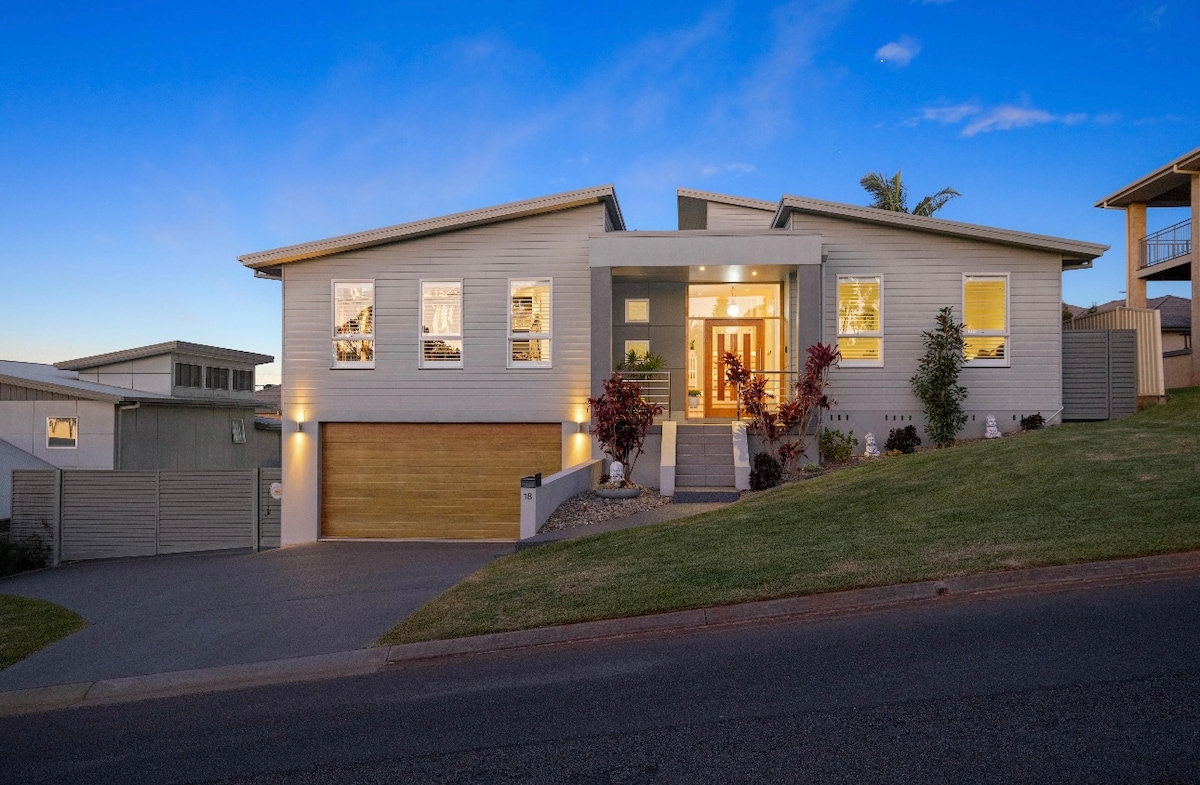 Breathtaking 180 views of the mountains & ocean. Very comfortable 3 bedroom beach house with a sun drenched sunroom & large NW facing deck with heated plunge pool. Full kitchen equipped with everything you need. Wood fireplace with wood supplied. All Linen & towels supplied. Another large quiet undercover deck at the back surrounded with beautiful gardens and large fenced yard. Perched on the hill overlooking Crescent Head This house is perfect in summer or winter.