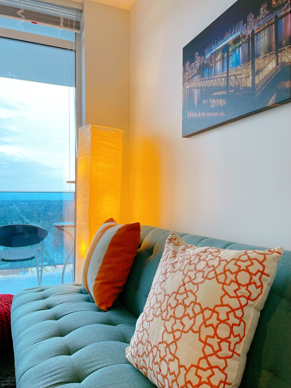 Savour the stunning Vancouver sunsets. Enjoy the spectacular view of the mountains and the city from the spacious balcony or inside the modern glass upscale 2 bedroom condo. Delight from a stylish experience at this centrally located place which is 5 minutes from the skytrain and within walking distance of shops and restaurants. The condo is air conditioned, fully equipped kitchen, wifi, TV, free access to downstairs gym as well as the dedicated. Experience luxury, peacefulness beauty.