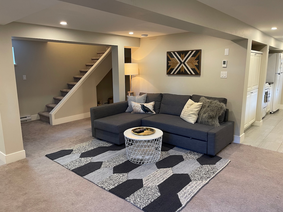 Modern, bright basement studio with queen bed and sofa bed. Fully equipped kitchenette includes cooktop, microwave, kettle, cookware, and flatware. Private bathroom with large walk-in shower and in-suite washer/dryer. Located in a quiet neighborhood near SFU—easy access by foot, transit, or car. Just 30 mins to Downtown Vancouver by car, or 45–60 mins by transit. Clean, comfortable, and stocked with all necessities. Note: We love pets but we DO NOT allow cats.
