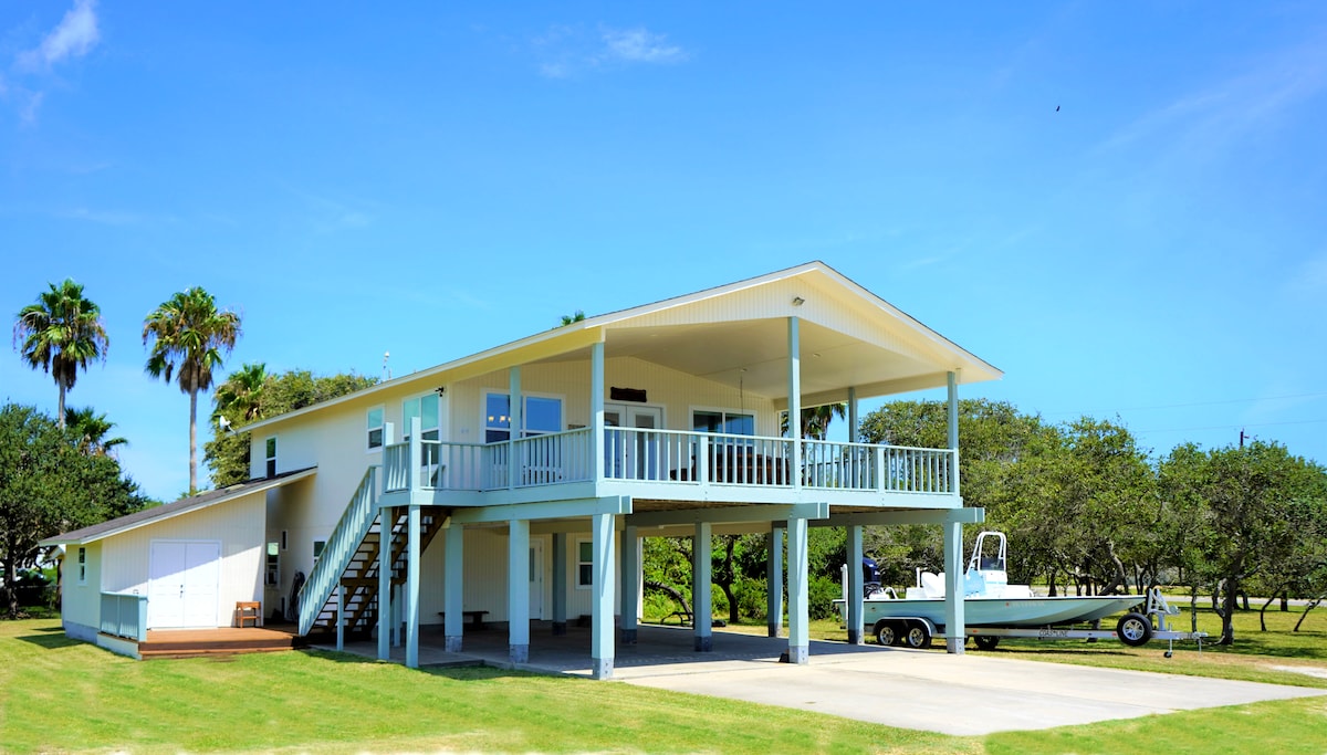 Situated in Port O'Connor and mere steps away from Front Beach, this home is the pinnacle of vacation destinations! Perfect for fishing, hunting, festivals, or simply unwinding, our abode offers all you could desire. The vistas of Matagorda Bay are breathtaking, while the televisions and Wi-Fi ensure connectivity to the world beyond. Features an in-house laundry room, and a golf cart is available (additional fee applies). A memorable experience awaits at our beachside retreat!