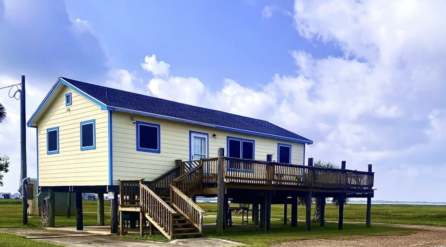 Situated in Port O'Connor and mere steps away from Front Beach, this home is the pinnacle of vacation destinations! Perfect for fishing, hunting, festivals, or simply unwinding, our abode offers all you could desire. The vistas of Matagorda Bay are breathtaking, while the televisions and Wi-Fi ensure connectivity to the world beyond. Features an in-house laundry room, and a golf cart is available (additional fee applies). A memorable experience awaits at our beachside retreat!
