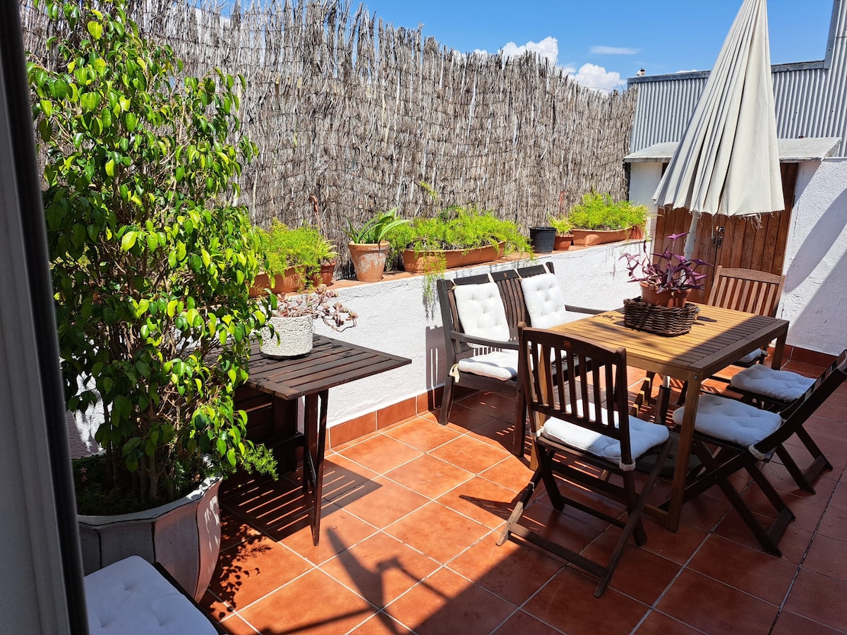 This gorgeous 90m2, bohemian duplex ONE BED apartment has amazing views over the entire city from the large plant -covered terrace. Walking distance from Las Ramblas. There is a bedroom with Queen sized bed downstairs beside a long balcony and another open-plan living area upstairs beside the terrace. There's a smart Tv, free wifi and washing machine and dryer. (please note: it's on the 6th floor and there's NO elevator).Tourist tax (€6.25 per person/per night) IS INCLUDED in the nightly price.