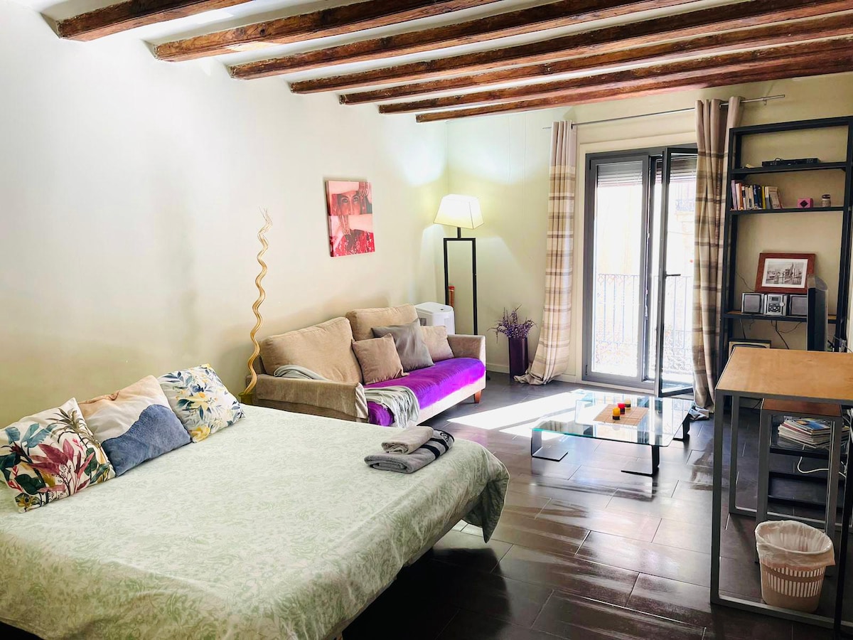 LEER ANTES DE RESERVAR Estudio ideal para tu vacaciones , en el barrio más antiguo de Barcelona ( Raval ) El estudio es limpio y acogedor, la tercera persona deberá dormir en el sofá ( no es sofá cama ).Ideal para grupo de amigos , personas descomplicadas , sin prejuicios ni pretensiones , viajeros experimentados. Llega caminando a los principales lugares de interés cultural de la ciudad . Por favor su equipaje debe ser ligero ya que se accede por escaleras a una cuarta (4 ) planta.
