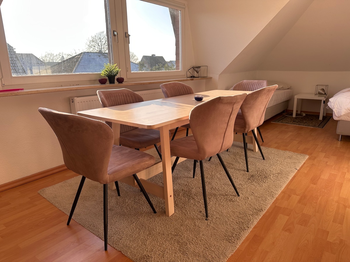 Diese Wohnung (47 m²), mit separatem Eingang und sonniger Terrasse hat zwei helle Zimmer mit offener Küche und Bad mit großer Dusche. Sie hat eine Fußbodenheizung, Fliesen und Rollläden. Eine Waschmaschinebefindet sich im Erdgeschoß. Das Haus liegt in einem idyllischen Hanggrundstück am Waldrand. Von hier aus kann man wunderschöne Ausflüge starten, die durch Wälder und an vielen Seen entlang verlaufen. Appelbeck am See 3 km. Rosengarten 5 km. Buchholz und Buxtehude 15 km. Hamburg ist 36 km