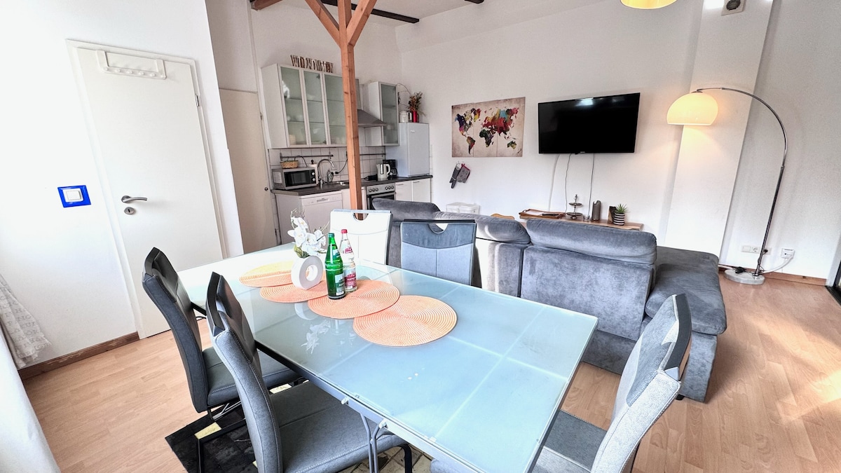 Industrieller Charme im Herzen von Eimsbüttel. Unser liebevoll eingerichtetes Loft bietet mit dem Schlafbereichen im Hauptraum und zwei separate Schlafzimmer insgesamt Platz für bis zu 7 Gästen. Der großzügige Loftbereich lässt genügend Raum für eine unvergessliche und gemeinsame Zeit in Hamburg. High Speed WLAN, ein großer Design TV, ein Acarde Pac Man sowie ein Videorekorder mit vielen alten geliebten Videokassetten lassnen sicherlich nicht nur die Herzen von Kino Fans höher schlagen.