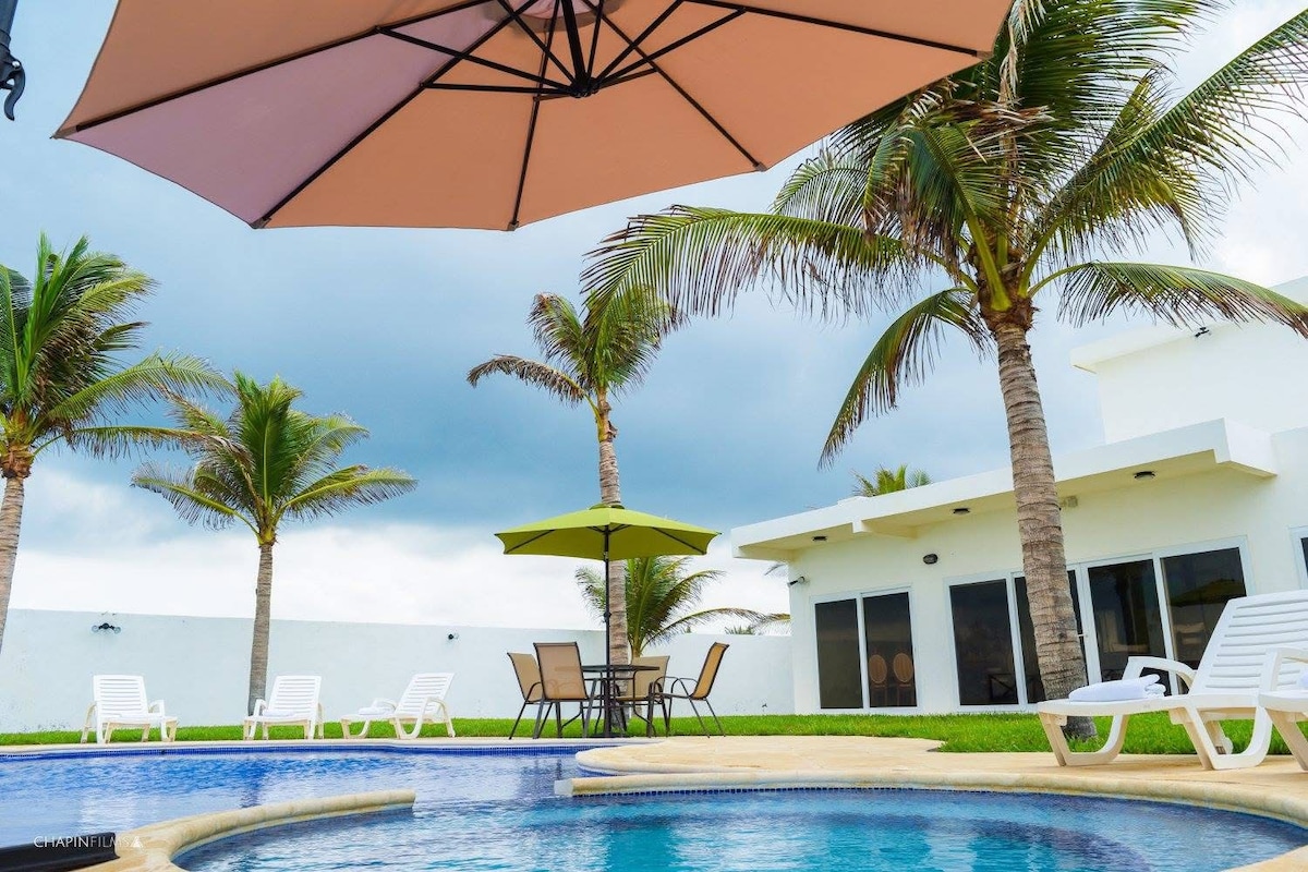 Comoda casa en el mar de un solo nivel, la playa esta a 300 mts de la casa. Parqueo para 6 carros, aire acondicionado en toda la casa. Piscina de 15 x 6 mts (profundidad 140/160 cms) + area para ninios. Todas las habitaciones con bano privado, toallas, sabanas y almohadas, cocina bien equipada, estufa gas y electrica, churrasquera gas, microondas, licuadora, tostador, cafetera, refrigerador, air fryer, congelador y enfriador en el rancho. WIFI, TV cable, projector en sala. Grupos familiares.