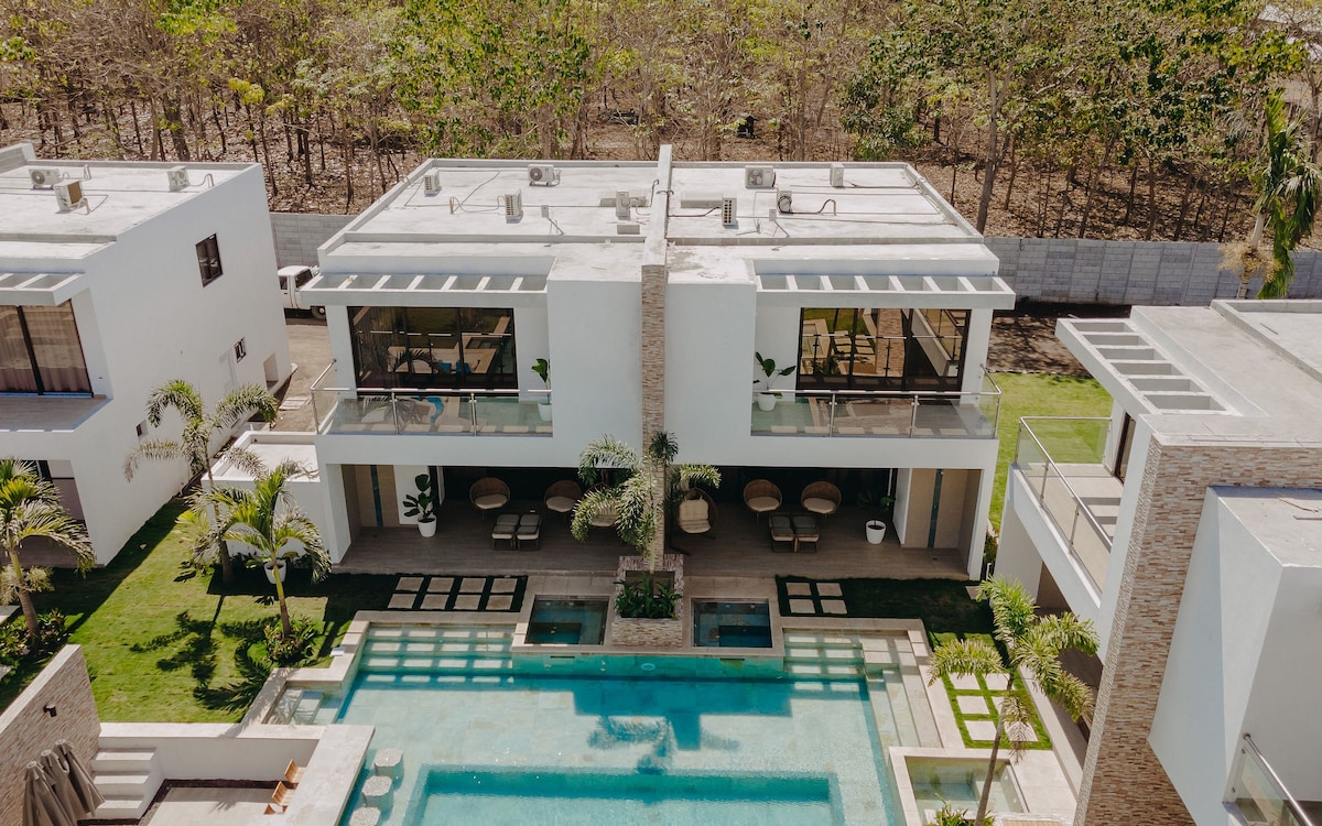 Con tu familia crea recuerdos inolvidables en esta casa en condominio seguro, con cocina moderna completamente equipada. Piscina privada grande con diferentes alturas para todas las edades, y múltiples sombrillas para tener sombra en la piscina. Acceso privado a la playa. Mesa de Ping-Pong, Juegos de niños y jardín de 500 metros para juegos al aire libre. Duerme cómodamente en 5 habitaciones con aire y TV, 16 camas en total. Parqueo para 4 carros dentro de la propiedad, más parqueos de visita.