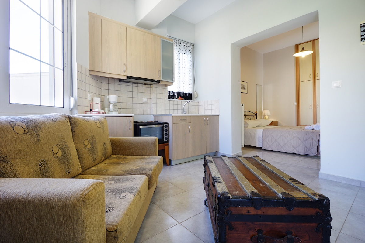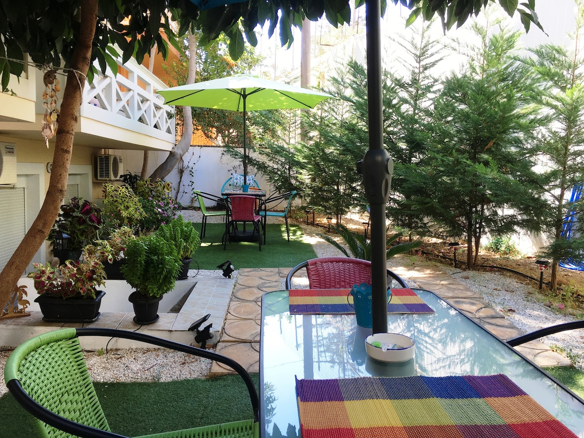Cozy and quiet ground floor -two rooms- studio 35 m2, comfortable and fully equipped for two persons, with a comfortable double bed, plus kitchen & bathroom, and a beautiful garden outside full of trees and flowers. It is located in the quiet area of Korakies about 10 min by car from the Chania city center, airport and Souda harbor. Only in 3 min by car you can visit Venizelos Graves (magnificent panoramic view of the town), 15 min to the historical monastery of Gouverneto.