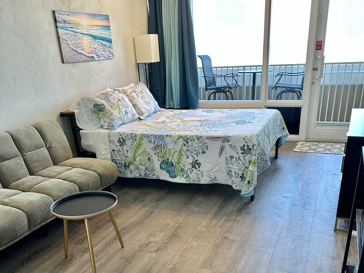 Weekend getaway. Time to rewind? Visit our oceanfront studio. We supply everything you will need! We have beach access, no damage, and an open pool! Safe, quiet building of only 33 units. The OCEAN is located directly in front of this comfy condo, with no roads to cross! This is a remodeled 2nd floor 389 sq ft condo at the Symphony Beach Club. Private balcony and full kitchen no need to leave the premises. This is a DIRECT OCEAN FRONT unit with an ocean view from your private balcony.