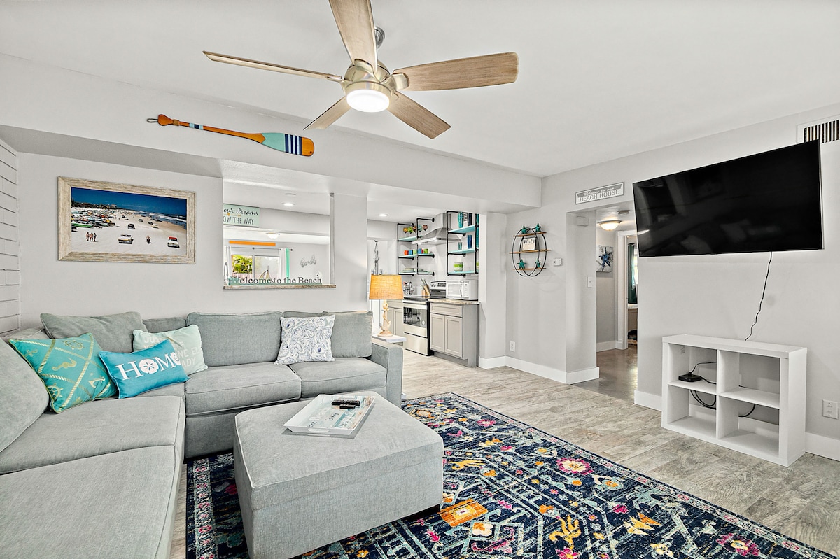 Laid back coastal vibes only 2 blocks from the beach! Completely renovated, private pool, walkable to several restaurants, tiki bars, shopping & attractions. Pool & beach loungers, rafts and toys available for your enjoyment! We also provide a beach wagon to help transport your things on the short walk to the beach. Beautiful wide beaches that you can drive on! Ramp to drive on beach just 1 minute away. Pet friendly 🐾 Walkable 🚶Fantastic location 📍2 blocks to beach 🌊 Owner managed ⭐️