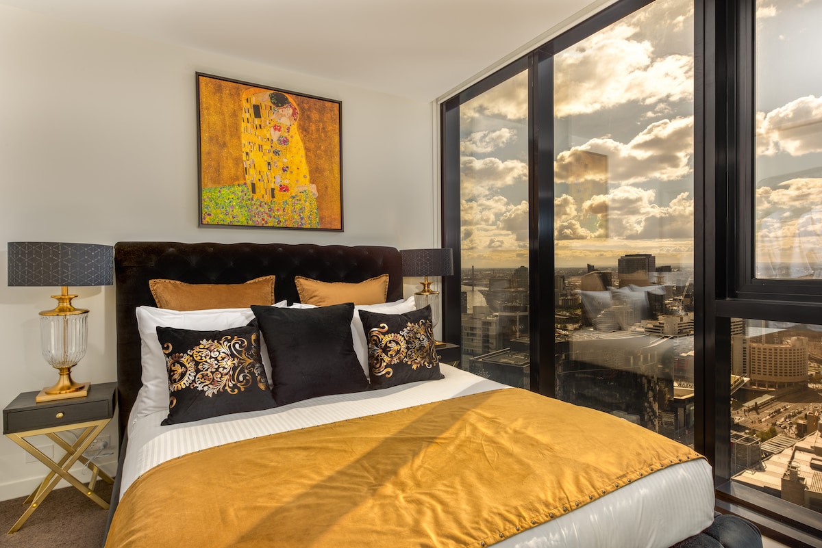 WELCOME TO LUXOR Dream beneath Klimt's glittering Kiss, where a sea of city lights stretches to the horizon and Melbourne's skyline is entirely yours. Glamorous, beautifully appointed and made for guests who want something unforgettable. ◈ Private glass-walled balcony above the skyline ◈ Two bedrooms, each with ensuite bathroom ◈ Onsite parking included ◈ Woolworths Metro on the ground floor ◈ French cafe opposite, Crown Casino steps away ◈ Convention Centre and Southbank dining, 5min walk