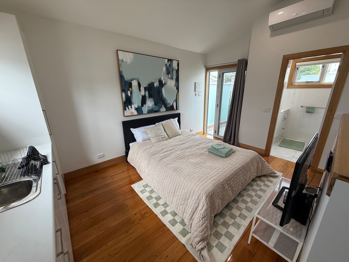 Great studio ( bedroom and bathroom) with private access allowing you to experience the best of airbnb with hotel privacy. The studio is like a hotel room - light filled and modern. 3 mins walk to the beach, 7 to St Kilda. 20 mins to city