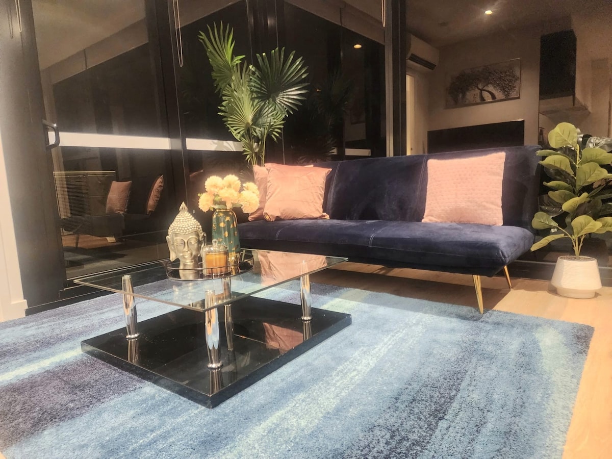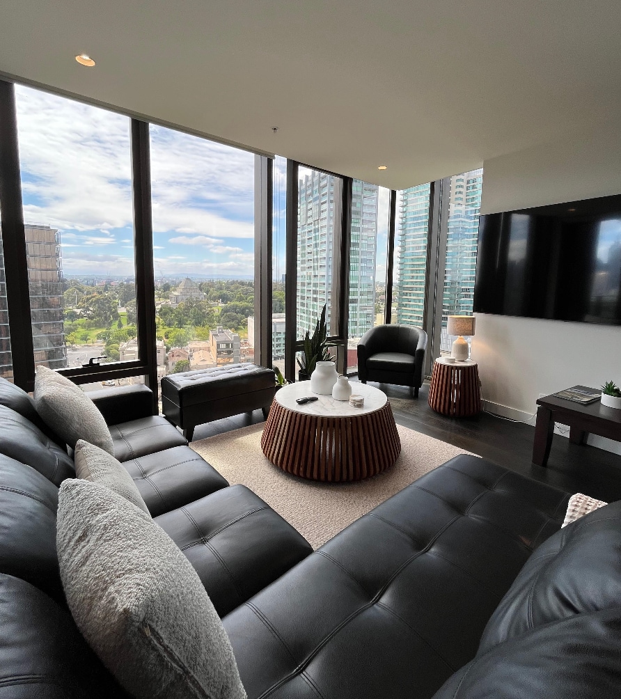 Step into a stylish Southbank retreat where moody modern design meets breathtaking views. From every room, take in uninterrupted panoramas of Melbourne’s skyline and harbour, creating the perfect backdrop for your stay. Rich tones and sleek finishes set the scene for a space that’s as sophisticated as it is comfortable, an elevated city escape that feels effortlessly welcoming. Live the city. Love the stay. BnI Stays.