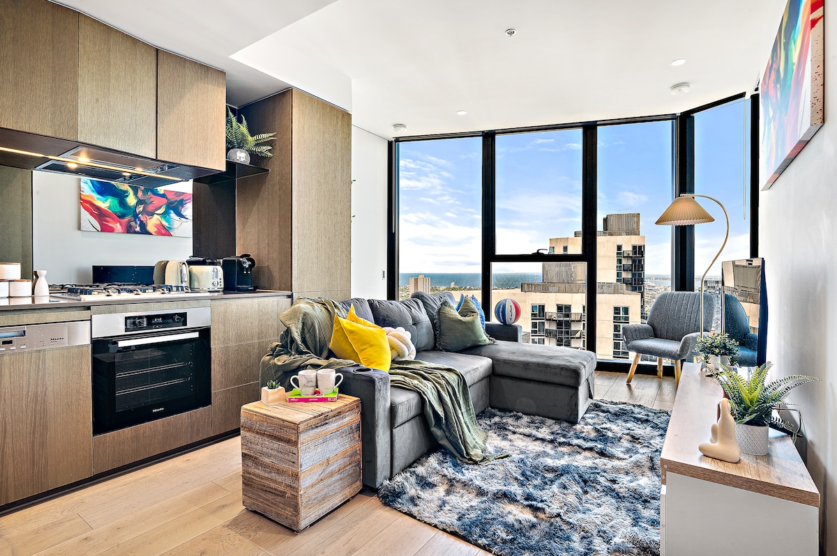 Located high above Southbank and very easy walking distance from Crown Entertainment Complex, Melbourne Convention Centre, River Precinct and all the Melbourne CBD, this suave and spacious (80 sq mtr) apartment is ideal for your city break. With spectacular skyline views visible through floor-to-ceiling windows in every room, a stylish fit-out and sweeping views of Melbourne and the bay, you'll feel like you're in a five-star hotel. Can we recommend some champagne as the sun sets over the bay?