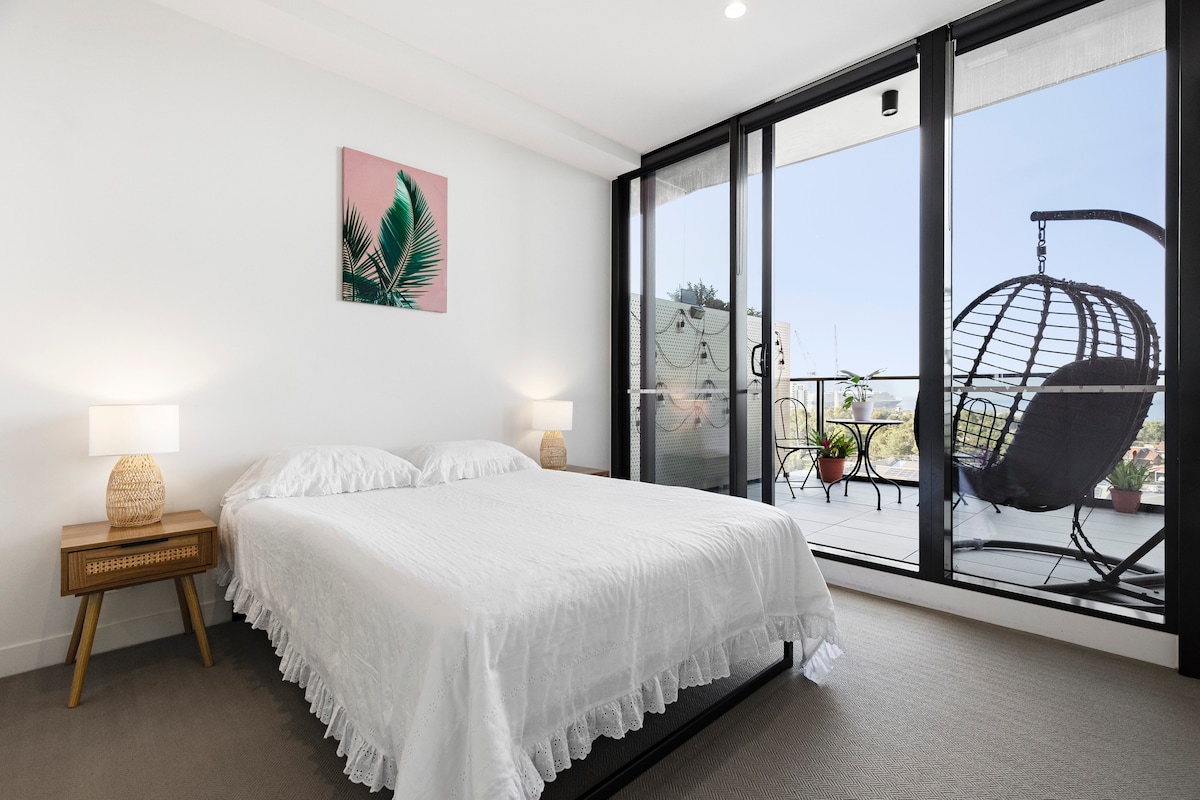 Luxury Penthouse with Balcony | Stunning Views | Overlooking F1 Circuit & Albert Park Lake • Open-plan living and dining area • Floor-to-ceiling windows and polished concrete floors • North-facing kitchen with premium appliances • Master bedroom with king-sized bed and ensuite walk-in shower • Second bedroom with access to bathroom and laundry • Bose surround sound system for premium entertainment • Rooftop swimming pool and gym facilities • On-site building manager and secure parking