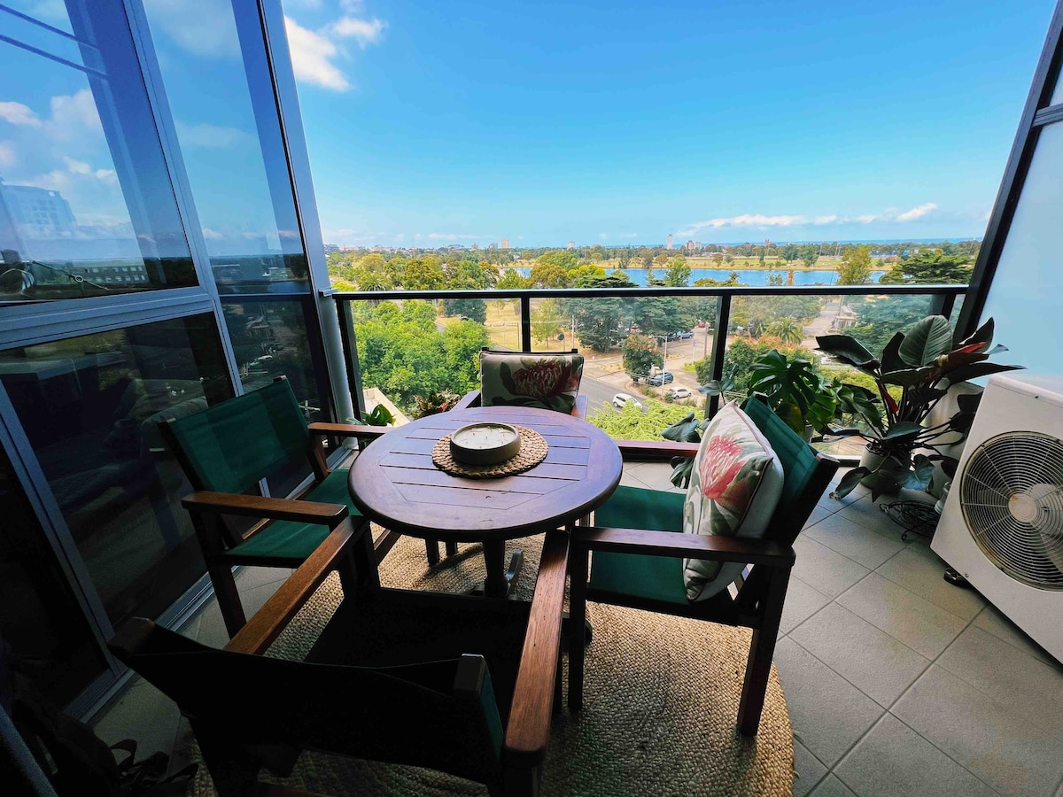 This two-bedroom apartment has stunning views across Port Phillip Bay and Melbourne CBD. It’s 80 metres to the city tram and 10 minutes by tram to MSAC. The penguin viewing platform and the Australian F1 track are 10-minute walks away. There are numerous restaurants, many within walking distance. One highlight is drinks on the balcony as the sun sets across the bay. And early risers may catch the hot-air balloons as they drift across the city.