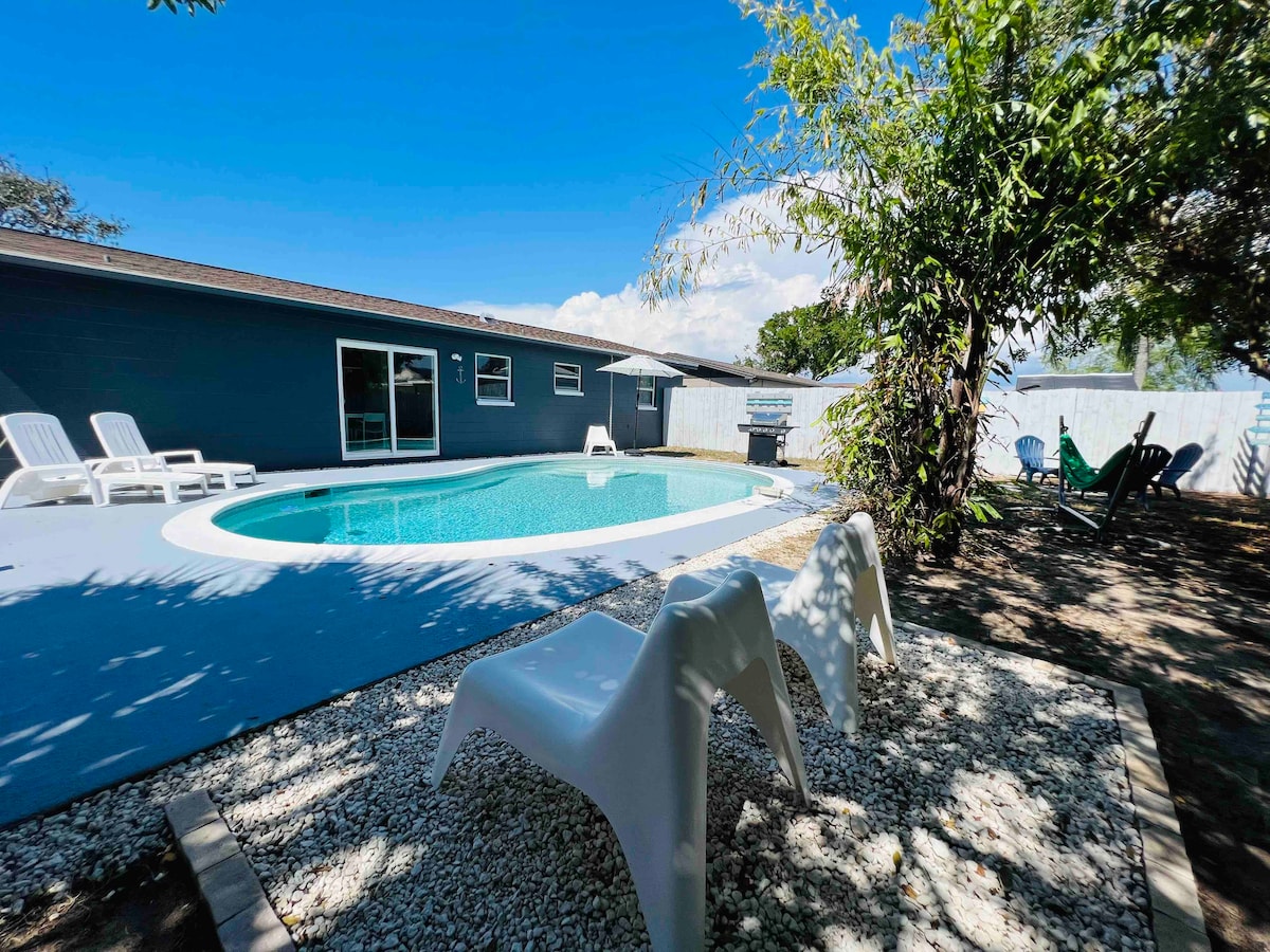 Cozy beach themed 1,000sq ft pool home in Port Richey, FL. Relax by your private outdoor heated year round pool or take a drive over to the sponge docks in Tarpon Springs to sample authentic greek cuisine. Want to swim with the Manatees or go scalloping? Then check out the nearby city of Weeki Wachee. Close to multiple beaches, state parks, restaraunts, and local attractions. Fishing poles and equipment on site to take with you to the beach or pier.