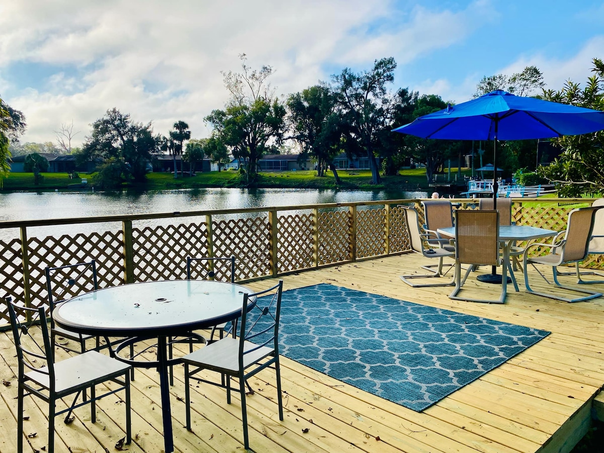+Spacious family retreat on lake +Free heated pool +Huge last-minute discounts +Big deck, BBQ, dining & firepit +Private backyard lakefront +3 bedrooms, 1 king, 1 queen, 2 twin +3 full baths +Easy to cancel +Pet friendly +Fishing +Games +Quiet serene safe +5 minutes to Gulf sunsets +5 min to Sims Park +20 min to Tarpon Springs +39 min to Tampa airport +50 min to Busch Gardens +5 min to restaurants +Fully equipped kitchen +Free parking & garage +Washer-Dryer +Work area +Hi-speed WIFI +Smart TVs