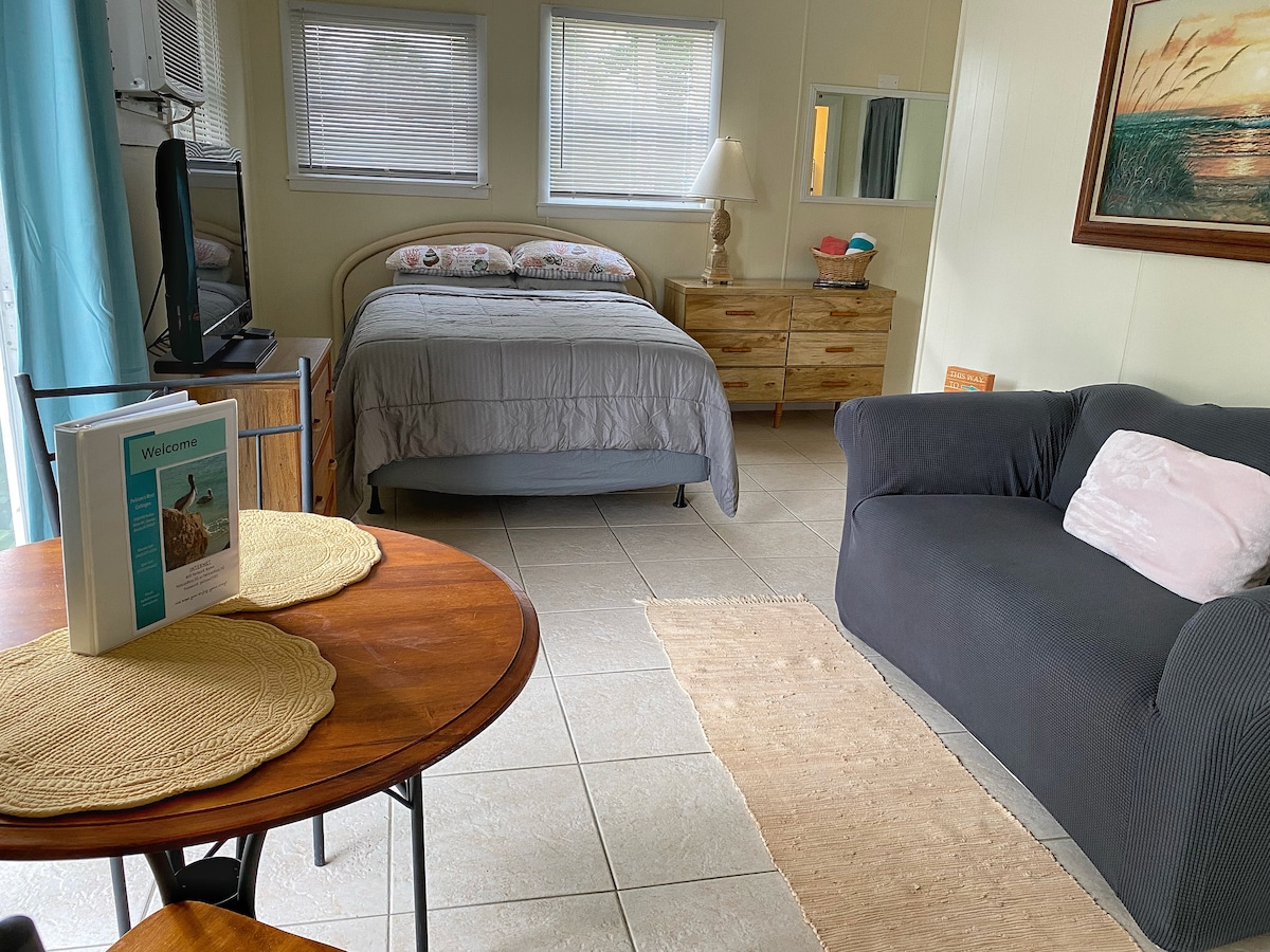 BLUE LEISURE – A is a cozy efficiency for 2, with a high-end murphy bed that easily converts from a couch to a queen bed. The unit offers a roomy kitchen, updated bathroom and great storage for your belongings. Located less than a mile from beautiful downtown Stuart, you’ll enjoy a huge variety of shops, restaurants, bars and waterfront sightseeing as well as fishing and beaches just a short car ride away! Laundry on premises.35 per dog fee. 2 Dogs max. No Cats.