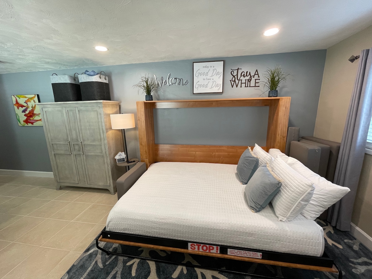 BLUE LEISURE – A is a cozy efficiency for 2, with a high-end murphy bed that easily converts from a couch to a queen bed. The unit offers a roomy kitchen, updated bathroom and great storage for your belongings. Located less than a mile from beautiful downtown Stuart, you’ll enjoy a huge variety of shops, restaurants, bars and waterfront sightseeing as well as fishing and beaches just a short car ride away! Laundry on premises.35 per dog fee. 2 Dogs max. No Cats.