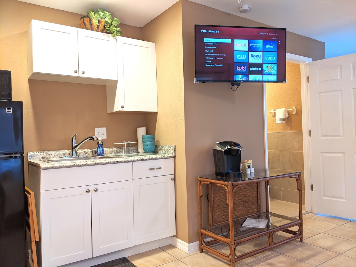 NO CLEANING FEE Suite has 3 rooms with the front door as your private entrance. Queen size bed,50 inch smart t.v.,small kitchen and combined sitting area and full private bath. The stocked kitchenette has coffee, dishes, silverware, napkins, paper towels, disinfectant wipes(if needed) microwave, fridge. There is a small leather loveseat and worktable. Free coffee/hot tea/snacks/cold drinks Separate work area Private entrance All cotton sheets Comfortable bed Quiet, non smoking property